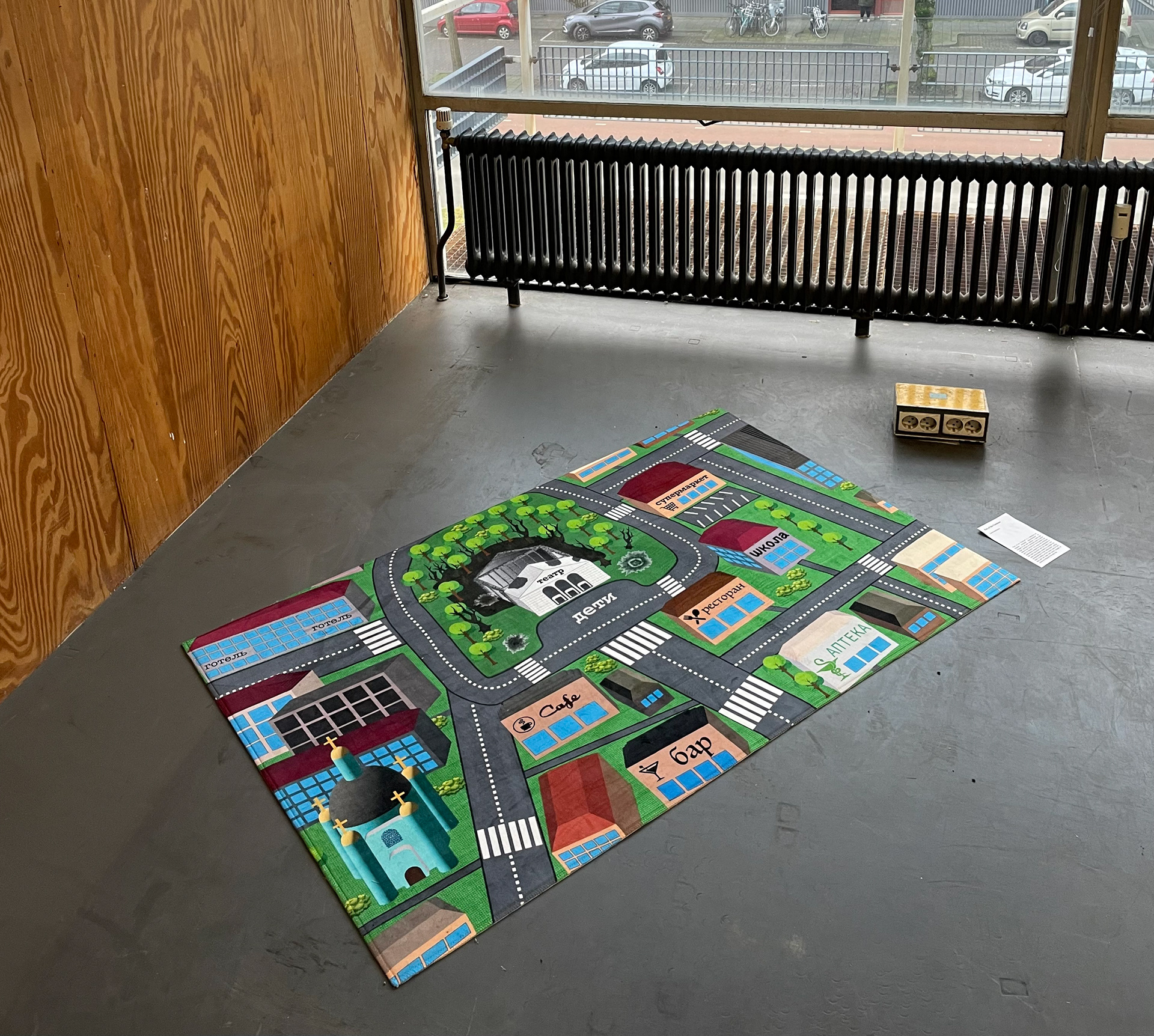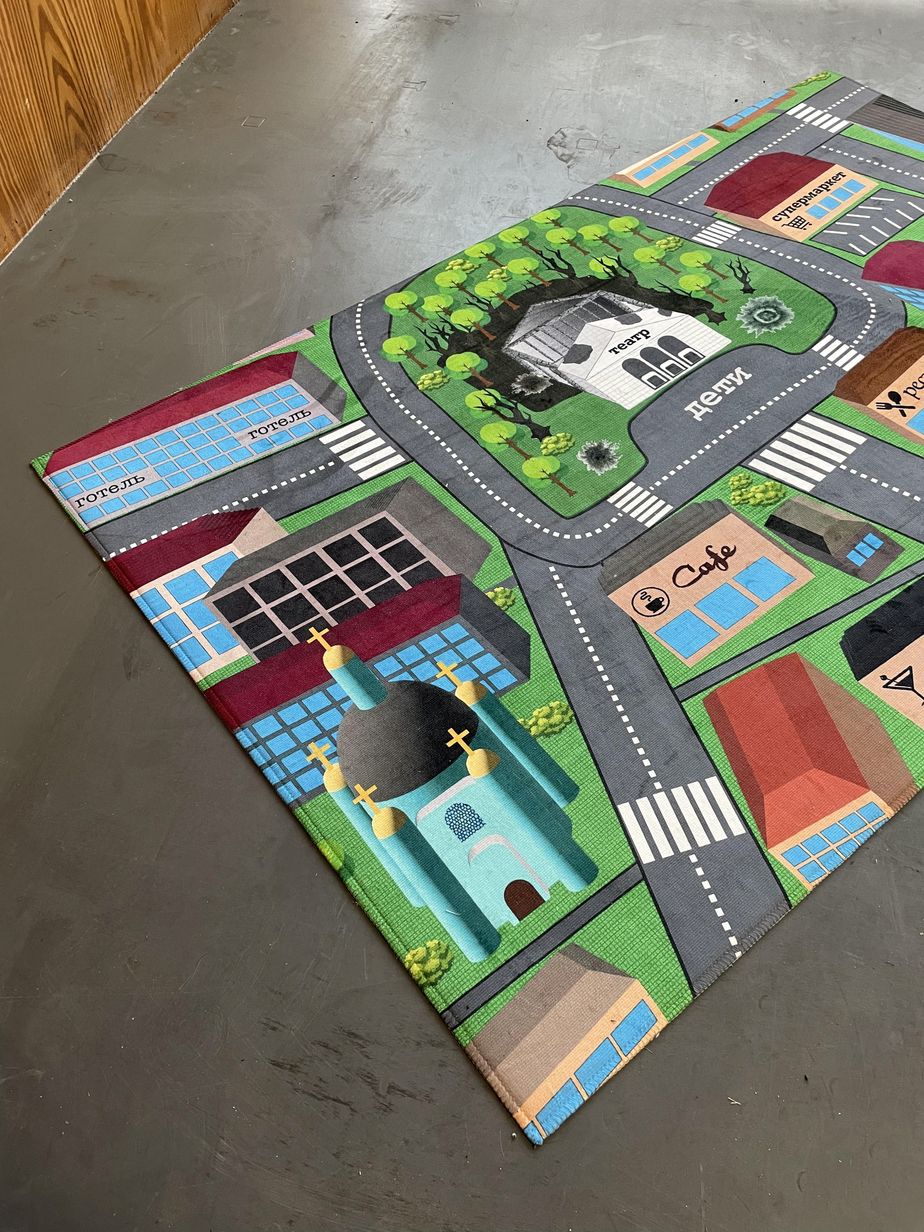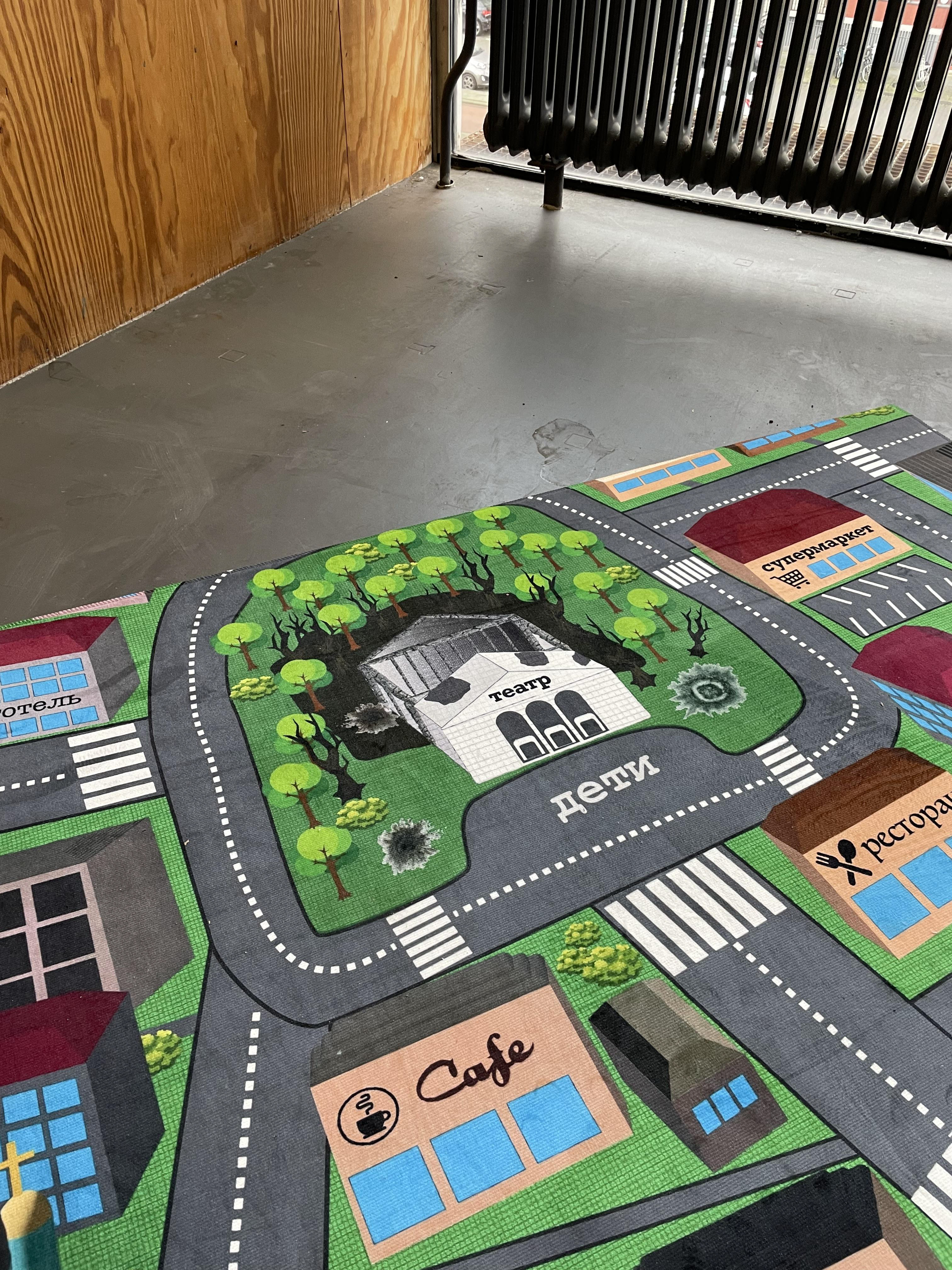 "Donetsk Academic Regional Drama Theatre" (2023) is the first work of the series "Part of the Furniture". It depicts the aftermath of the March 16th 2022 Russian strike on Mariupol’s drama theatre. The attack was carried out despite the theatre’s militaristic irrelevance and with full knowledge of the civilians seeking shelter inside. Residents had written дети (Russian for "children") on the pavement outside before seeking shelter. The attack is one of the earliest recorded war crimes of the 2022 invasion of Ukraine.